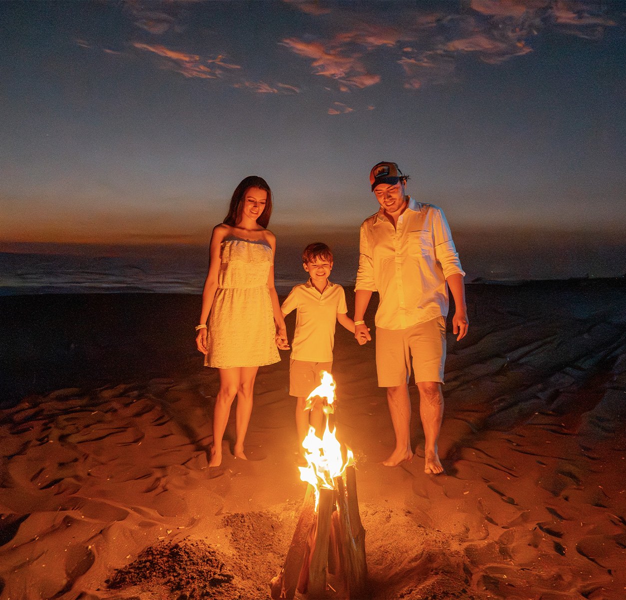 La playa se ilumina con nuestra fogata, un momento mágico para disfrutar con tus seres queridos bajo el cielo estrellado. Una experiencia que hace especial cada visita a Playa Paraíso.